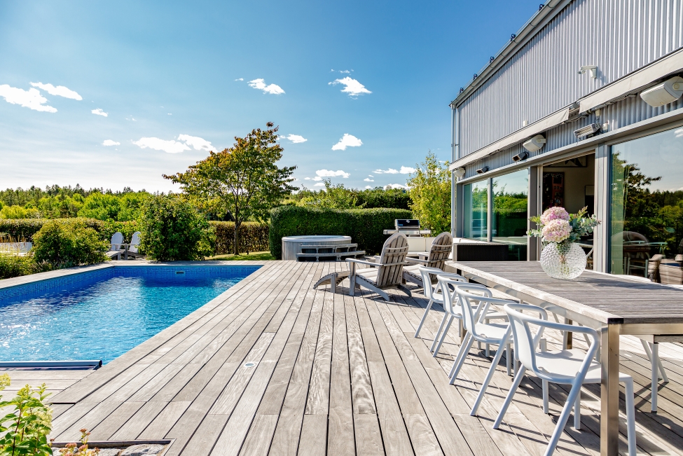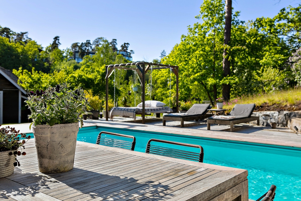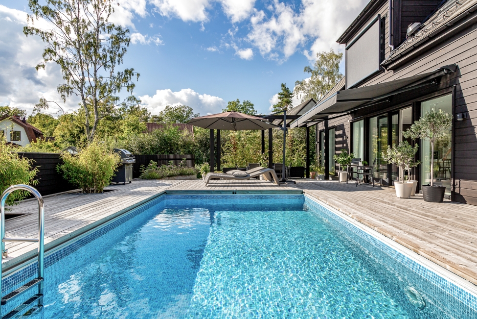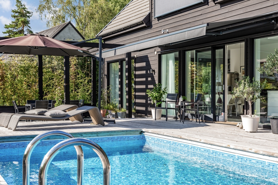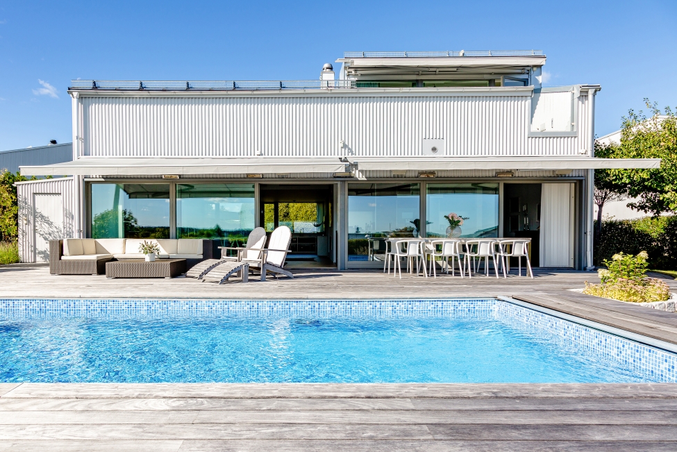 Arkitektritad villa Gåshaga Strand - Stilrena & exklusiva materialval - Ljus & rymd - Pool - Flertalet uteplatser - 4-5 sovrum - 3 badrum - Garage